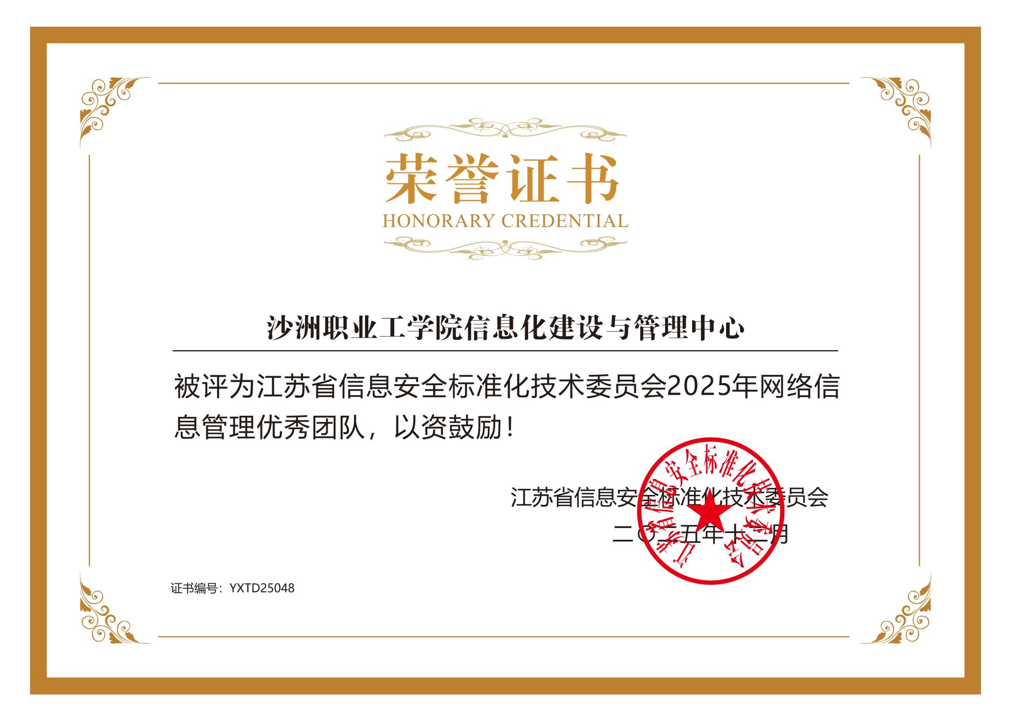 近日,我校信息化建设与管理中心被江苏省信息安全标准化技术委员会评为“2025年网络信息管理优秀团队”。信息化建设与管理中心一直致力于提升全校网络信息安全水平,积极推动信息化建设创新发展,推进学校教育教学和管理服务的数智化水平,赋能学校高质量发展和人才培养工作。