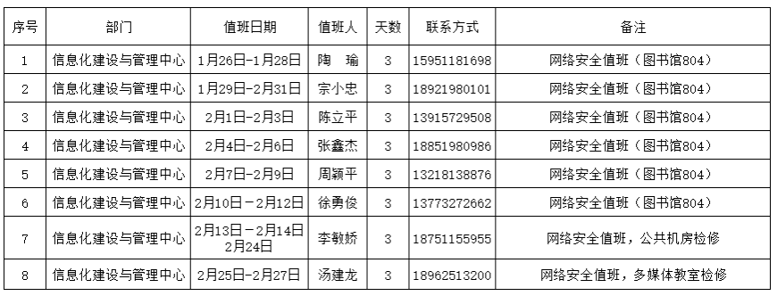 1.值班时间:上午:8:30——11:30,下午:13:30——17:00 2.值班人员按时到岗,认真做好值班记录,并配合做好基础设施维修维护工作。 3.值班人员要确保手机畅通,协调相关问题的处理。 4.值班期间,如遇突发事件及时报告总值班室和相关领导。
